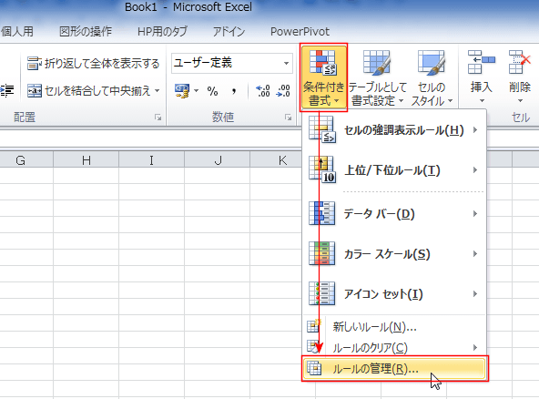 - [ホーム]タブの[条件付き書式]→[ルールの管理]を実行します。