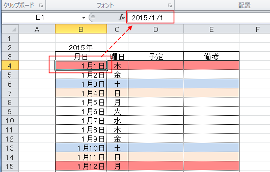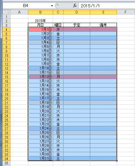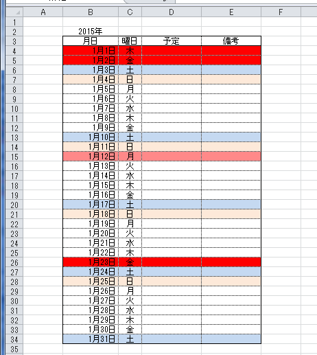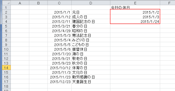 ここでは シート名が「祝日」のシートに2015年1月分だけを入力しています。