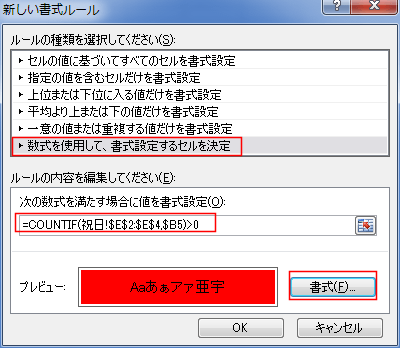 次の数式を満たす場合に値を書式設定に =COUNTIF(祝日!$E$2:$E$4,$B5)>0 と入力します。