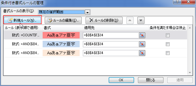 - 条件付き書式を設定する(追加する)セル範囲を選択します。