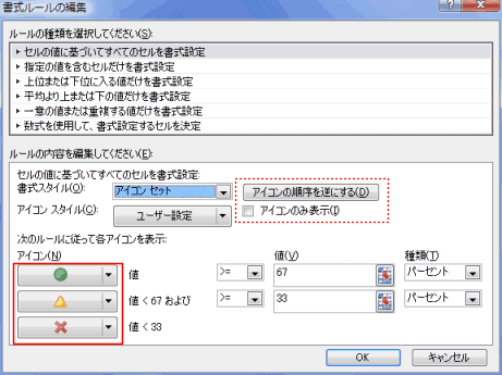 Excel2007ではアイコンのスタイルはセット単位でしたが、Excel2010では個別に選択できるようになっています。