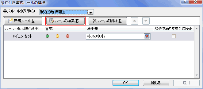 - [ホーム]タブの[スタイル]グループにある[条件付き書式]→[ルールの管理]を実行します。