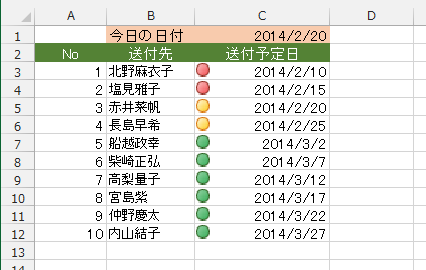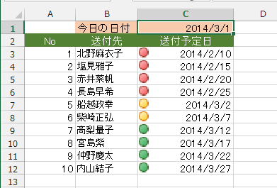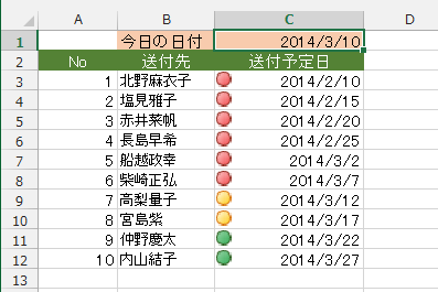 - 納入予定日を書き出したリストがあります。本日の日付から10日以上の期間が有れば「緑」、10日までなら「黄」、予定日が過ぎたら「赤」のアイコンで表示したいと思います。