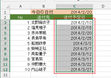 - 設定後のようす:ここではC1セルに入力された日付で判定していますが、ここに =TODAY() と入力して日々変化するようにもできます。