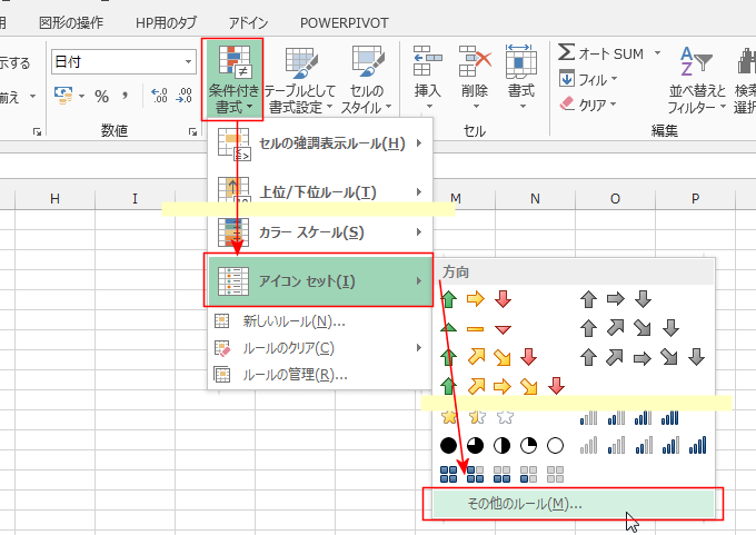 - [ホーム]タブの[条件付き書式]→[アイコンセット]→[その他のルール]を選択します。
