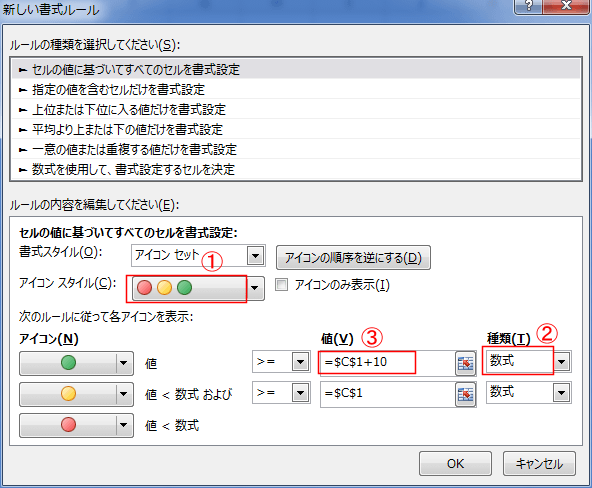 よねさんのExcelとWordの使い方|エクセル2010基本講座:目次|条件付き書式|アイコンセットに数式を使いたい(条件付き書式)