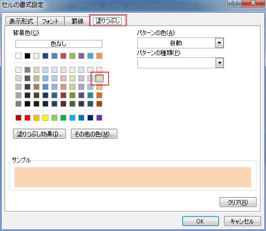 [書式]ボタンをクリックして、塗りつぶしの色を設定しています。
