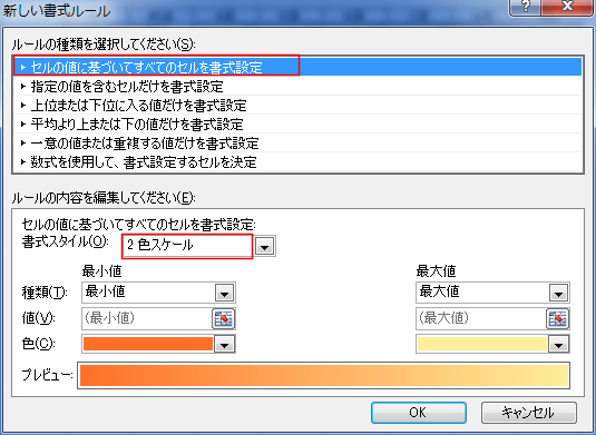 ルールの内容を編集してくださいで「2色スケール」を選択します。