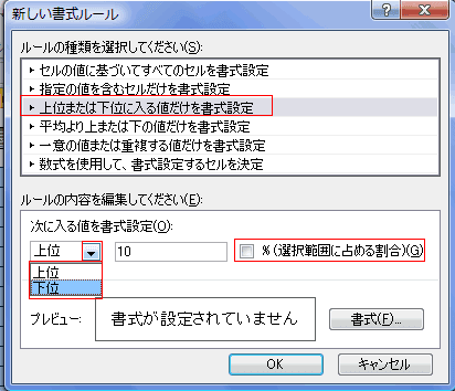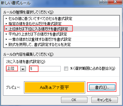 - [上位または下位に入る値だけを書式設定]をクリックします。以下の設定ができます。