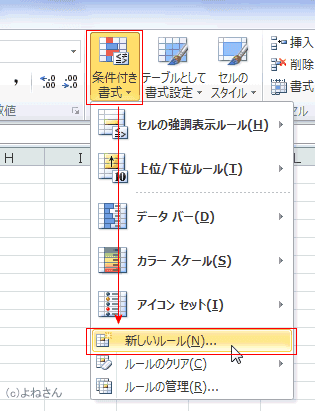 - [ホーム]タブの[スタイル]グループにある[条件付き書式]→[新しいルール]を実行します。