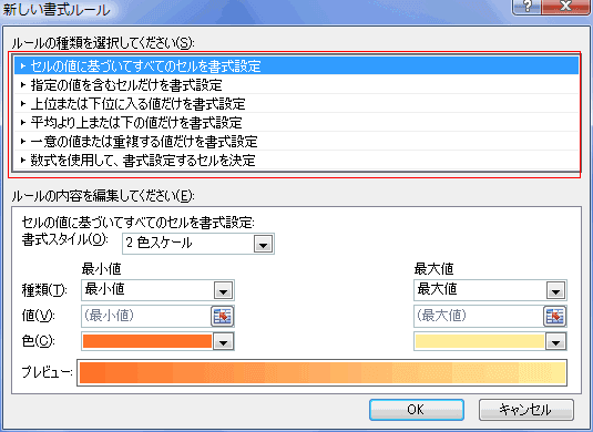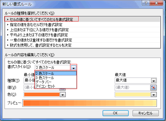 - [セルの値に基づいてすべてのセルを書式設定]をクリックします。以下の設定ができます。