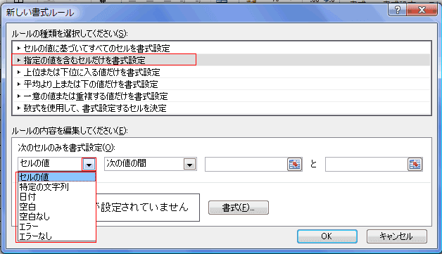 - [指定の値を含むセルだけを書式設定]をクリックします。以下の設定ができます。