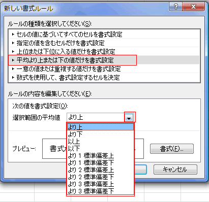 - [平均より上または下の値だけを書式設定]をクリックします。以下の設定ができます。