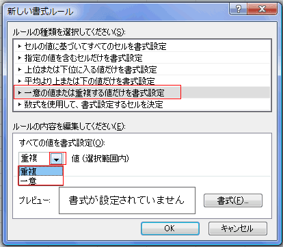 - [一意の値または重複する値だけを書式設定]をクリックします。以下の設定ができます。