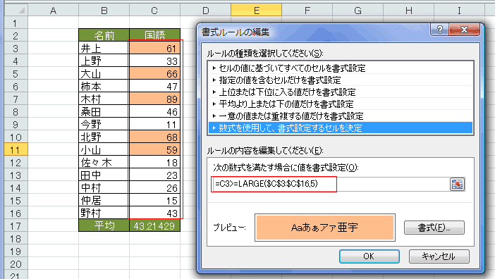 - C3:C16を選択して、=C3>=LARGE($C$3:$C$16,5) とし、上位5個のセルを塗りつぶした例です。