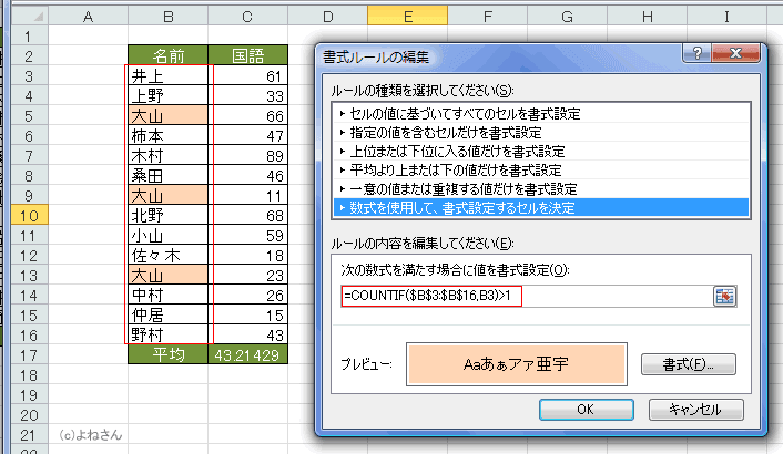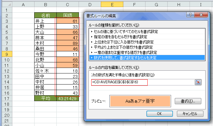 - C3:C16を選択して、=C3>AVERAGE($C$3:$C$16) とし、平均値より大きい値のセルを塗りつぶした例です。