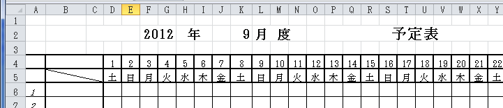 5行目の曜日は=IF(D4="","",DATE($F$2,$K$2,D4)) のような数式で日付を入れ、表示形式「aaa」として表示しています。