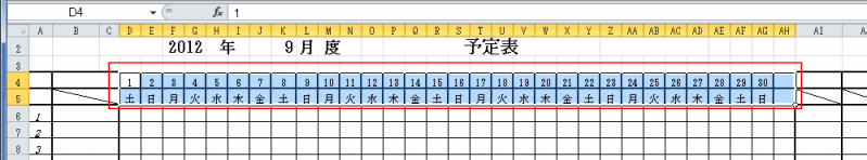 - F1セルに「年」、K1セルに「月」、D4:AH4セルに「日」が入力されています。