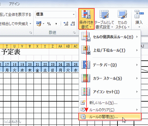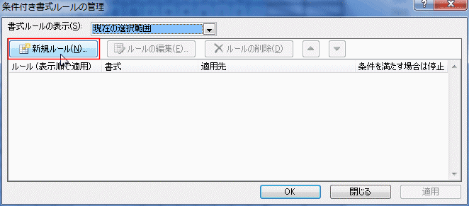 - [ホーム]タブの[条件付き書式]→[ルールの管理]を実行します。