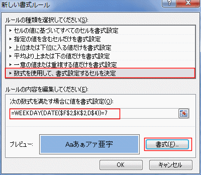 - 「数式を使用して、書式設定するセルを決定」を選択し、入力欄に土曜日の判定をする条件式を入力しました。