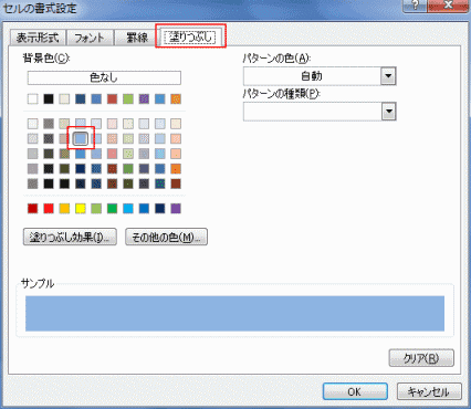 - 書式の設定は[塗りつぶし]タブを選択して青系の色を選択しました。