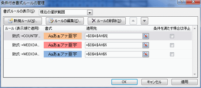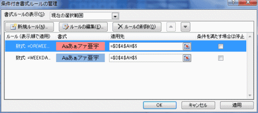 - [新規ルール]ボタンから、日曜日の判定、祝日の判定の数式を入力し、書式を設定しました。