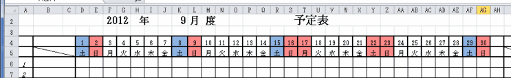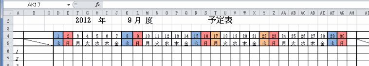 - 土曜日の判定:=WEEKDAY(DATE($F$2,$K$2,D$4))=7