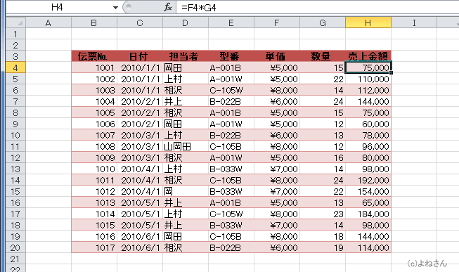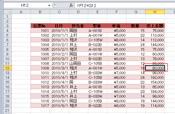 - 下図のような、H列には 単価*数量 を計算した売上金額の表があります。