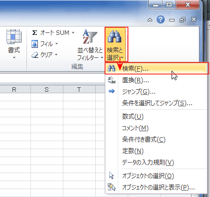 - [ホーム]タブの[検索と選択]→[検索]を実行します。