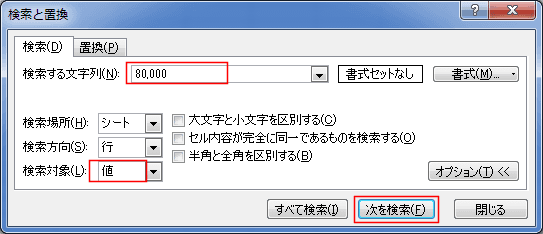 - 検索する文字列に「80,000」と入力します。