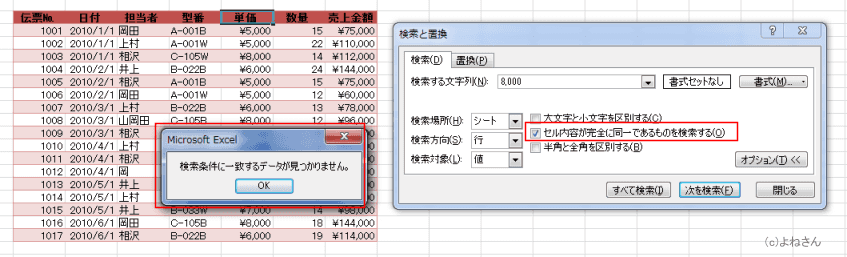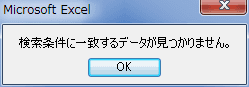 - 「セル内容が完全に同一であるものを検索する」のチェックを入れると、検索条件に一致するデータが見つかりません。」と表示されました。
