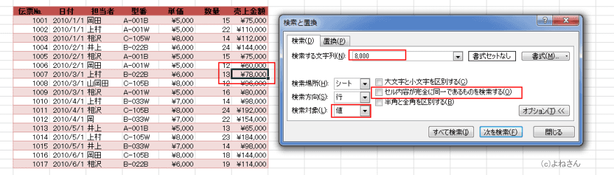 よねさんのExcelとWordの使い方|エクセル2010基本講座:目次|検索と選択(ジャンプ)|数値を検索したい