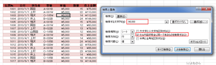 [次を検索]ボタンをクリックすると、「\8,000」が検索されるのはもちろんですが、「\78,000」も検索されます。