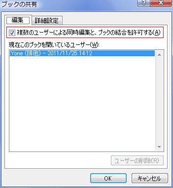 - [ブックの共有]ダイアログボックスの[編集]タブで「複数のユーザーによる同時編集と、ブックの結合を許可する」にチェックを外します。