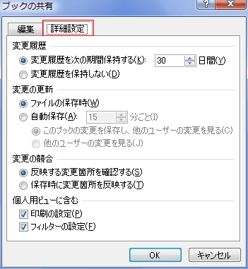 - [ブックの共有]ダイアログボックスの[詳細設定]タブで必要な個所を設定します。