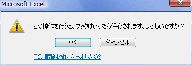 - 「この操作を行うと、ブックはいったん保存されます。よろしいですか?」とメッセージが表示されますので、[OK]ボタンをクリックします。