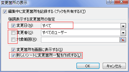 - 「新しいシートに変更箇所一覧を作成する」にチェックを入れます。