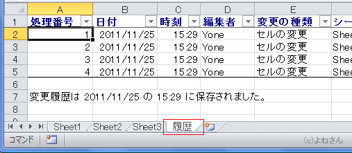 - [OK]ボタンをクリックすると、[履歴」シートが作成され、変更履歴の一覧のリストが作成されます。