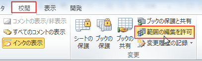 - [校閲]タブの[変更]グループにある[範囲の編集を許可]を実行します。