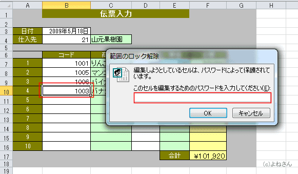 - 編集を許可した範囲に入力をするにはパスワードが必要になります。