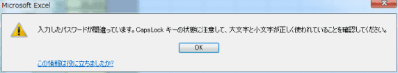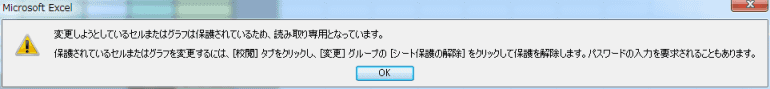 - シートの保護にて保護(ロック)されているところに入力しようとすると、下図のメッセージが表示されます。