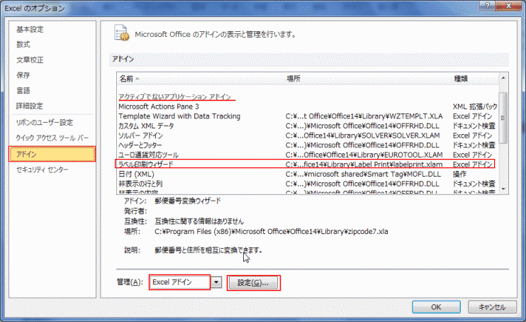 - [アドイン]を選択すると、アクティブでないアプリケーション アドインに「ラベル印刷ウィザード」が見つかりました。