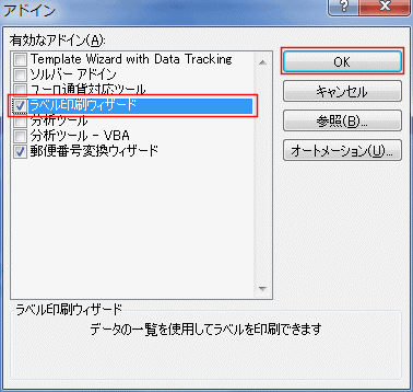 - アドイン画面が表示されましたので、「ラベル印刷ウィザード」にチェックを入れ[OK]ボタンをクリックします。