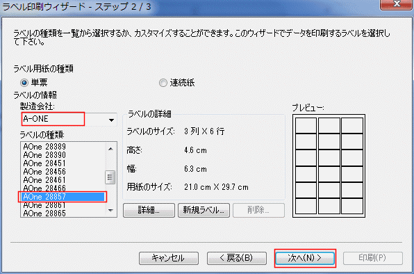 - 印刷するラベルの製造会社、ラベルの種類を選択して、[次へ]ボタンをクリックします。