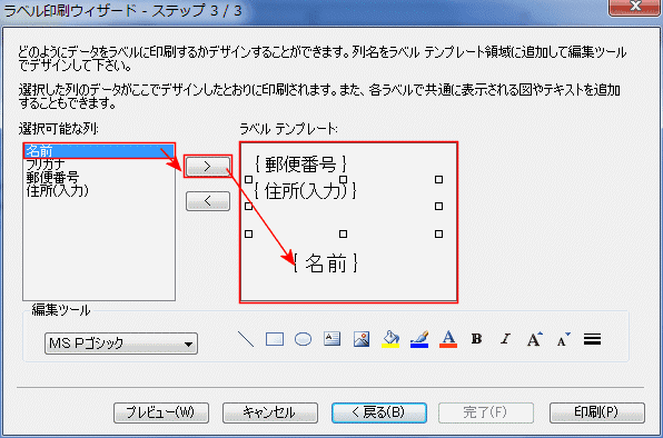 - 列見出しを選択して[>]ボタンをクリックすると、ラベル テンプレートへ配置されます。