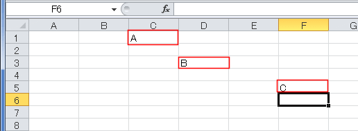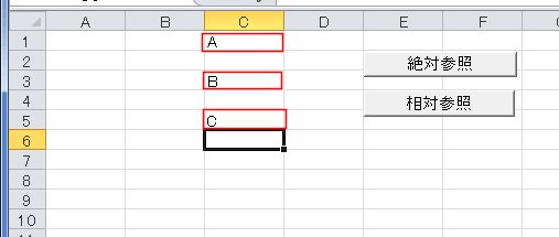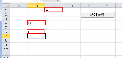 | Sub 絶対参照2() ' ' 絶対参照 Macro ' ' Range("B2").Value = "A" Range("B4").Value = "B" Range("B6").Value = "C" Range("B7").Select End Sub |