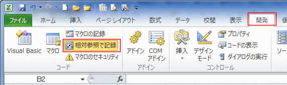 | Sub 相対参照2() ' ' 相対参照 Macro ' ' ActiveCell.Value = "A" ActiveCell.Offset(2, 0).Value = "B" ActiveCell.Offset(4, 0).Value = "C" ActiveCell.Offset(5, 0).Select End Sub |