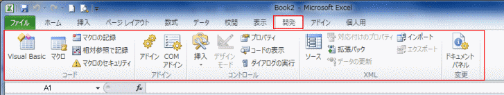 - マクロ(VBA)に関するコマンドが収められている開発タブは初期設定では表示されません。