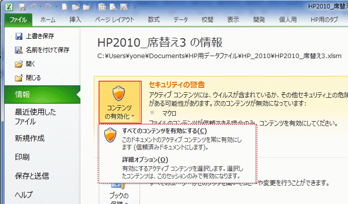 このファイルを開いているときだけ有効になり、次回からは再度、警告が表示されます。