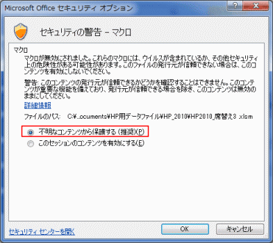 - 「不明なコンテンツから保護する(推奨)」にチェックを入れて、[OK]ボタンをクリックすると、マクロは無効になり使用できません。